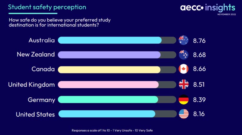 AECC(AECC Insights Student Survey)近日發(fā)布的《全球留學(xué)趨勢報告》中顯示,澳大利亞以8.76分(滿分10分)的高分位居榜首,被認(rèn)為是最安全的留學(xué)目的地;
