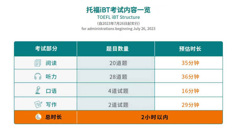 自2023年7月26日起, 托福iBT考試的時長將由三小時縮短至兩小時以內(nèi)。具體調(diào)整如下: